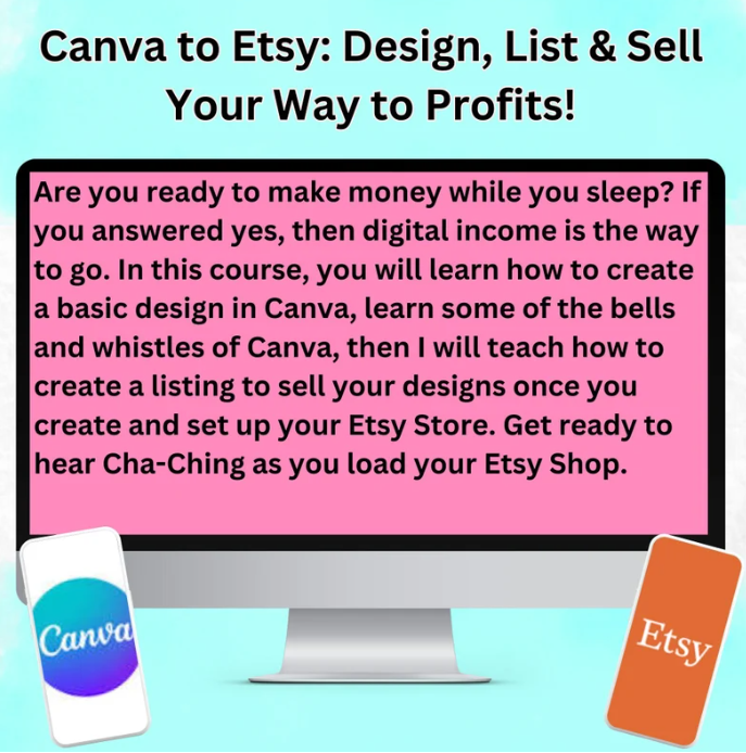 I was shopping during prime and I wanted to start an Etsy for digitals. I set up my storefront but stopped because the listing part made no sense. I saw this course and I was like I am going to take a chance. There are no chances needed because she ate this course up. She has to be a professor or an educator of some sort. She made it fun, she was truthful and she did exactly what she said. She showed me things in Canva which I had no idea about and she showed me how to upload my products to Etsy! The information is invaluable and what she is charging for this course is insane. I watched all three hours. She has a lifelong customer and I am def getting the Tshirt MasterClass next to add to my Etsy Shop. As a customer, I hate to say this, but this course is worth so much more than she is charging.